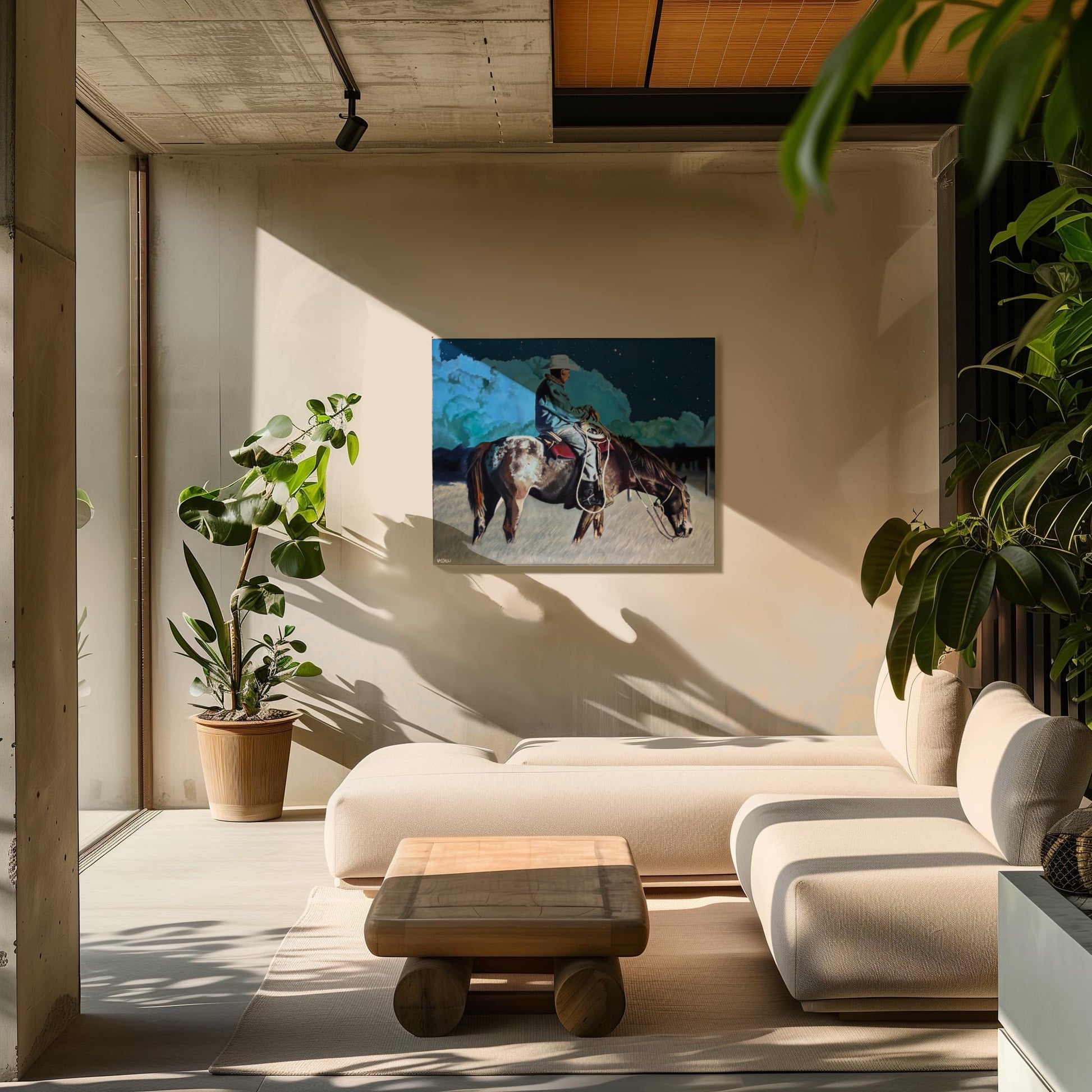 This original 16 by 20 inch oil painting, titled "Midnight Oil," captures the beauty of the old west with its stunning depiction of cowboys and the frontier under a beautiful, cloudy sky. Add a touch of western art to your home with this unique piece. Wall art preview is not to scale.